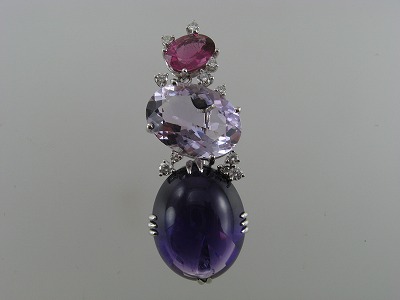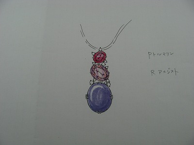 アメジストの指輪をリフォームしたいとのお話でした。デザイナーの小林由紀先生と相談の結果、デザインを描いて頂き、それにマッチしたローズアメジストとピンクトルマリンを加えて写真の様なペンダント&ブローチに加工させて頂きました。不要になった枠は下取りをさせて頂きましたのでご予算内でお作りすることが出来ました。アメジストという地味な石だったのにもかかわらず、華やかさを感じさせるデザインに仕上がったので、「これなら気軽に付けられる」と大変喜んで頂きました。(コンシェルジュ 篠原ひろみ)
