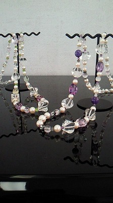 お母様の水晶のネックレスと、お祖母様のパールのネックレスに、天然石を足して二本のネックレスに