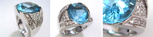 誕 生石のアクアマリンを使用したリングが欲しいというお客様のご要望でした。石の大きさ、ご予算、ジュエリーを身に着けるTPOなどいろいろ聞かせていただ きました。その結果存在感のある中石に、ゴージヤスでありながらシンプルなデザインに決定。丁寧な職人さんの手作りリングが完成しました。オーダーメイド ジュエリーの名前にふさわしいお品物に仕上がりました。
