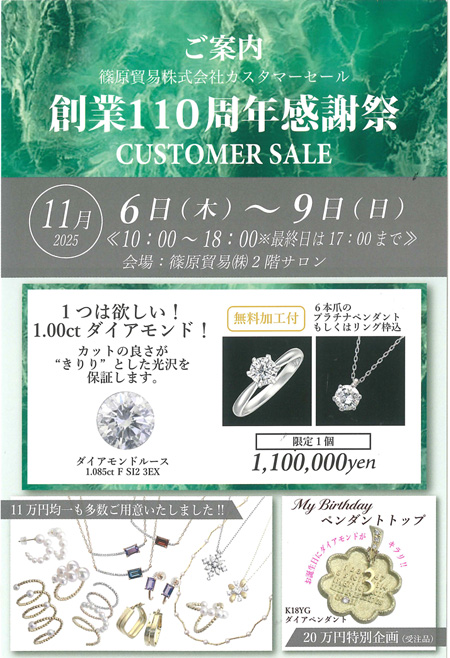 日頃のご愛顧に感謝の意を込めて、「創業110周年感謝祭」と題し、カスタマーセールを開催いたします。